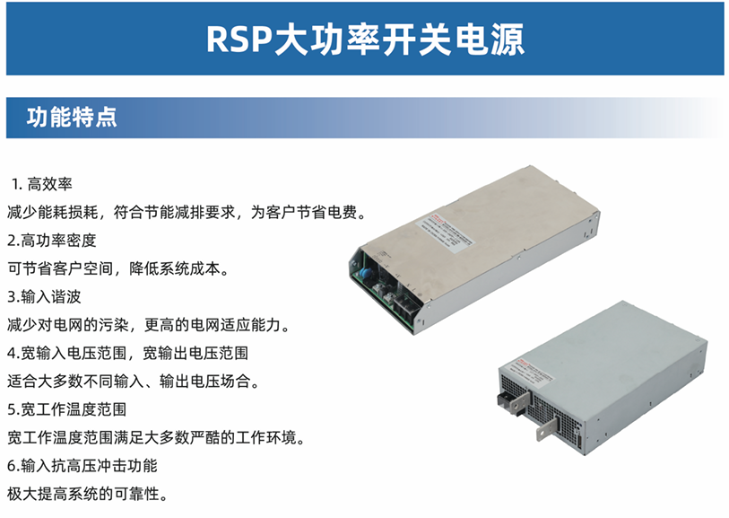 以100kW大功率工业电源、年运行8000 小时为例:传统效率 85%:年损耗 = 100kW × (1-0.85) × 8000h = 120,000 kWh。高效型 95%:年损耗 = 100kW × (1-0.95) × 8000h = 40,000 kWh。节电差:80,000 度 / 年 → 按工业电价0.8 元 / 度 → 年省电费 6.4 万元。旺马 WM-RSP 系列是广州旺马电子自研的大功率、超薄、主动 PFC、高效率工业开关电源,主打高功率密度、节能稳定、可并联扩容、宽温适配,覆盖 200W~3000W 全功率段,专为工业自动化、激光设备、新能源、工控机柜等大功率场景设计,是替代进口品牌的高性价比国产方案。