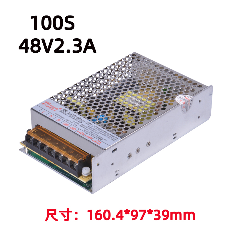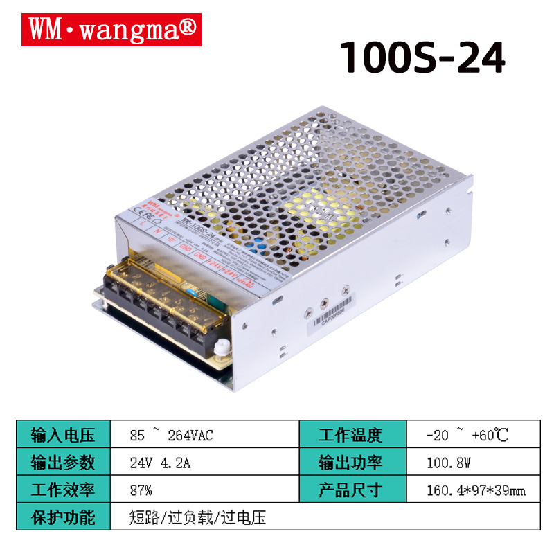 功率与输出电压:额定 100W;常规型号包括 WM-100S-5(5V/20A)、WM-100S-12(12V/8.3A)、WM-100S-24(24V/4.17A)、WM-100S-48(48V/2.1A),满足不同设备直流供电需求;输出电压精度 ±1%~±2%,纹波低,稳压性能强。