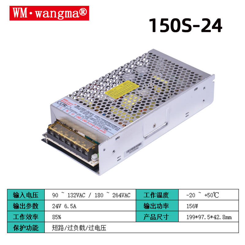旺马150W开关电源核心优势:体积小、易导轨 / 壁挂安装;宽压抗浪涌,适应电网波动;超低空载功耗,节能环保;工作温度 - 30℃~+70℃,适应严苛工业环境。