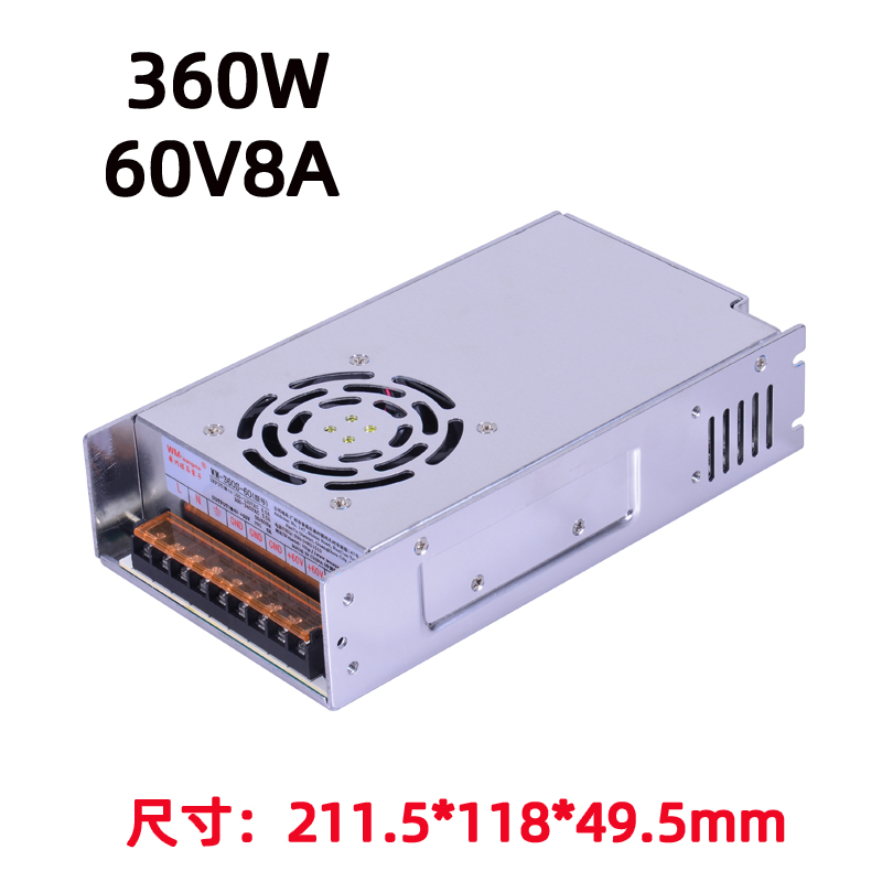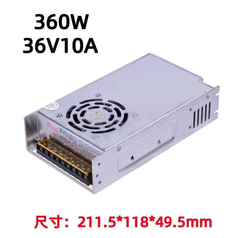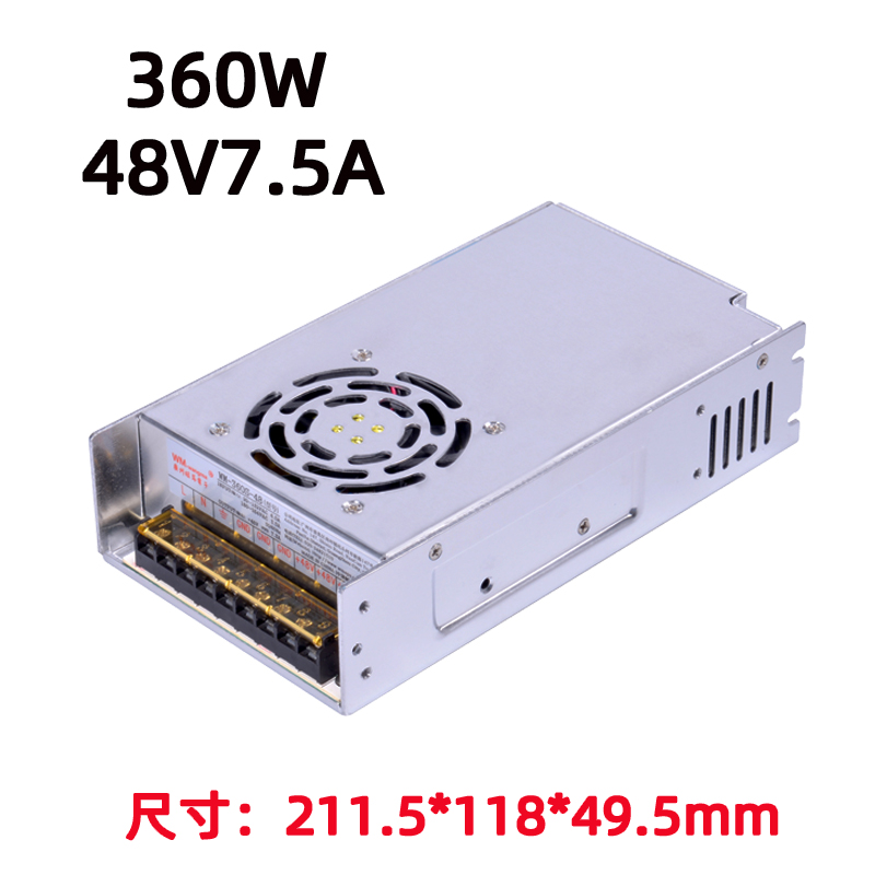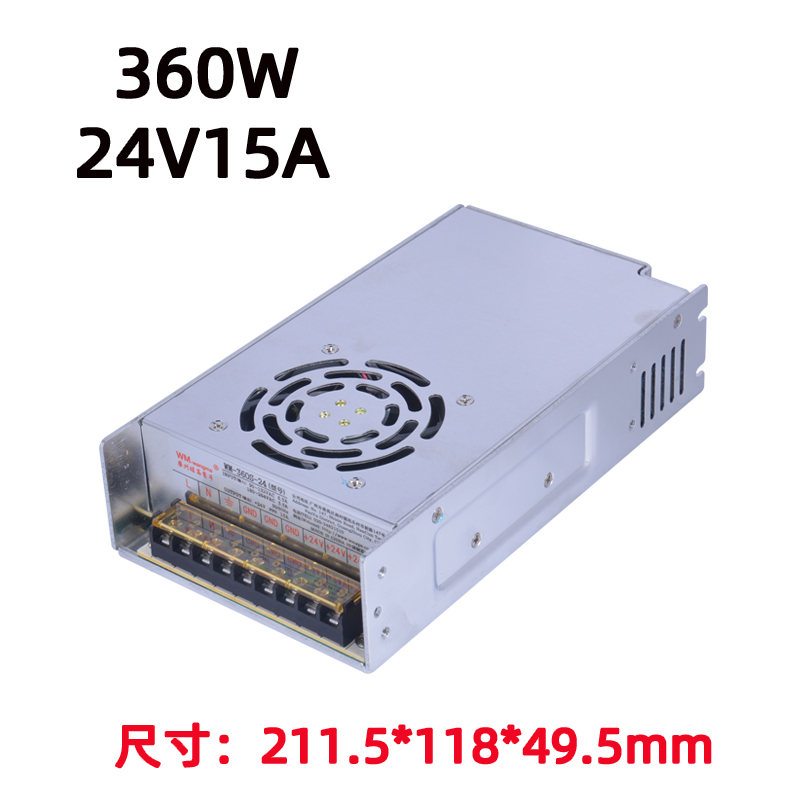 功率与输出:额定 360W;WM-360S-12开关电源:12V 30A;WM-360S-24开关电源:24V 15A;宽范围 AC 输入(85–264VAC,50/60Hz),全球通用;输出电压精度 ±1%,纹波低。