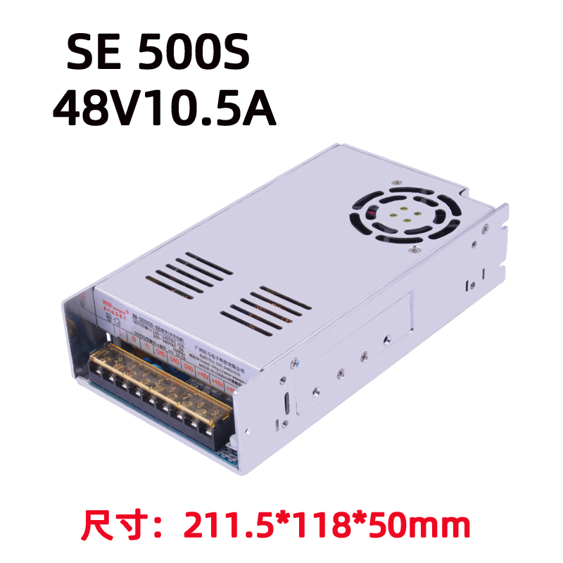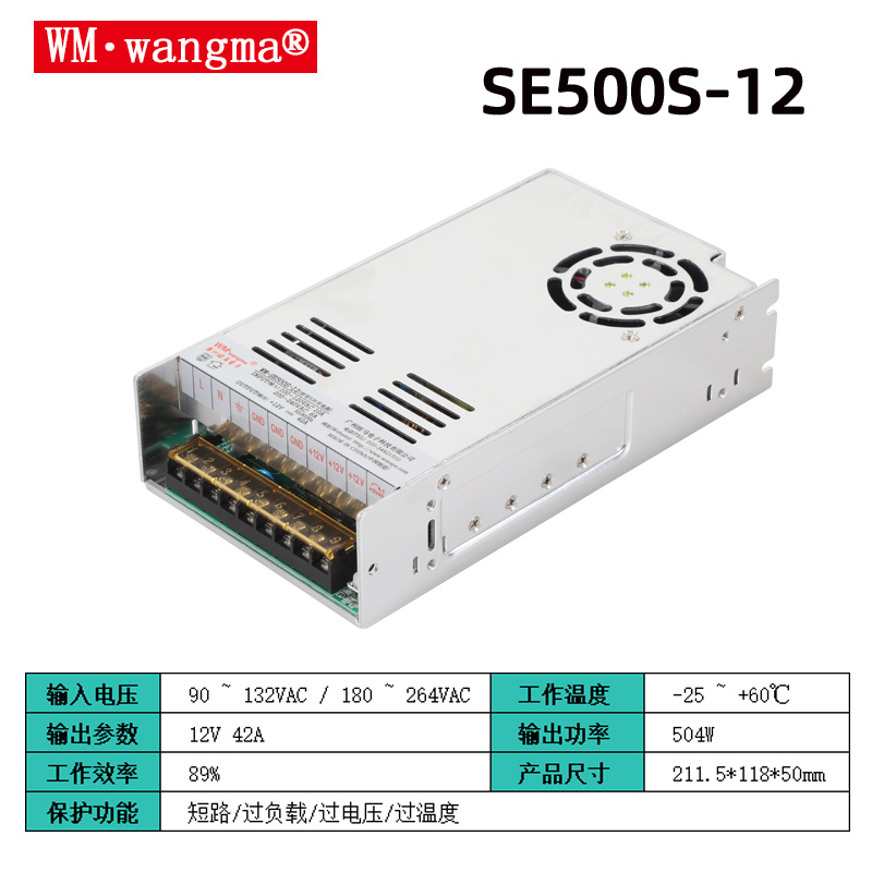 标准型号:WM-SE500-12(单路 12V 41.7A)、WM-SE500M-12-5(双路 12V 30A +5V 10A,合计 500W)