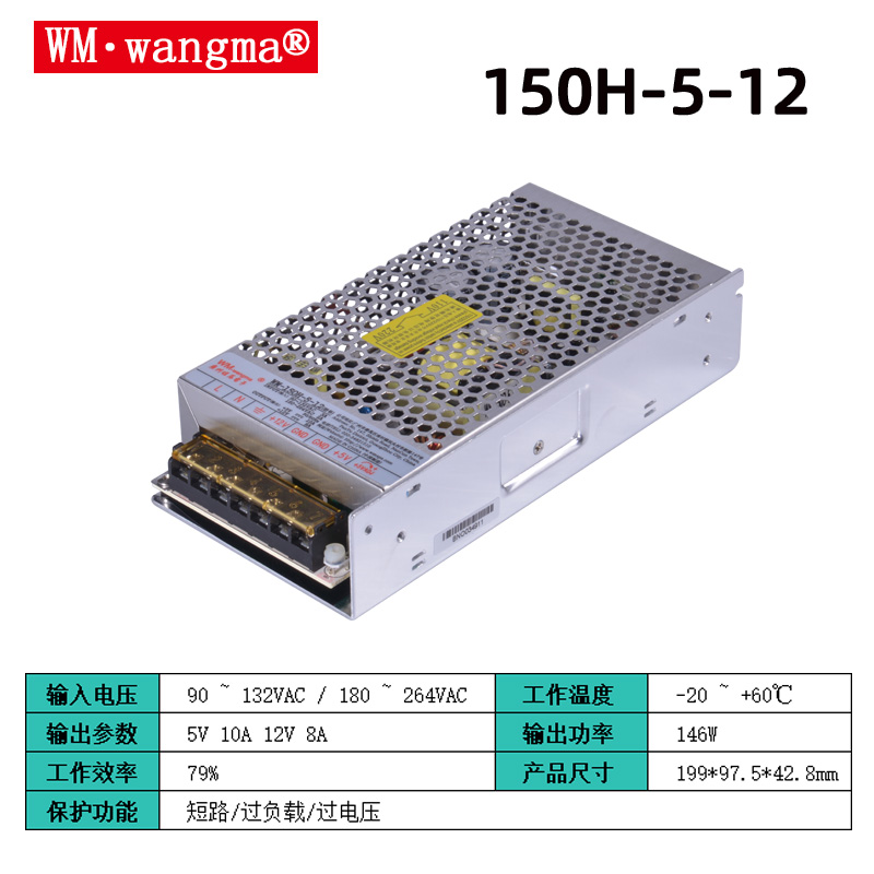 旺马 WM-150H-5-12 双路输出工业开关电源(150W 5V+12V 铝壳机型),这是一款专为工控、游乐设备、自动化设备设计的 AC/DC 稳压电源。