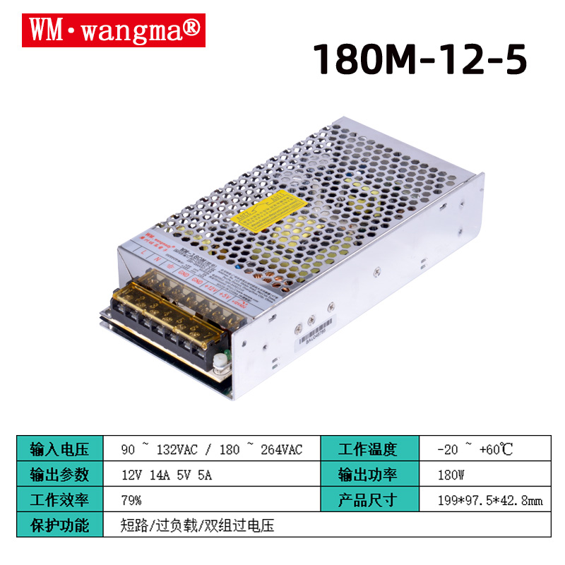 旺马 WM-108M-12-5 是一款108W 双路稳压输出的工业级开关电源,专为工控、游乐、安防等设备提供12V+5V双电压供电,属于旺马 M 系列双组稳压机型。