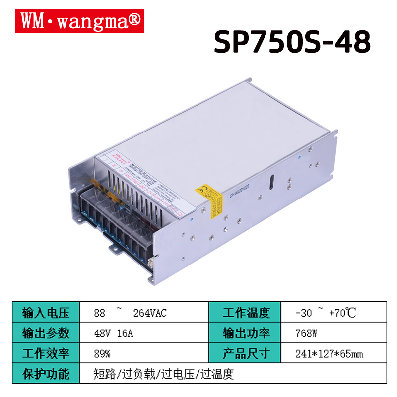 输出:DC 48V,额定电流 15.7A,额定功率 750W;支持微调(通常 ±10%),负载调整率低,纹波噪声≤50mVp-p;