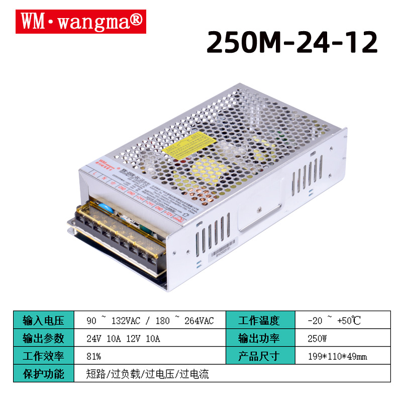 旺马 250M-24-12(24V+12V 双路)250W 工业级双组稳压开关电源,这是广州旺马电子面向工业自动化、安防监控、游乐设备等场景推出的高可靠性 AC/DC 电源方案,属于 250M 双组输出系列的核心型号。
