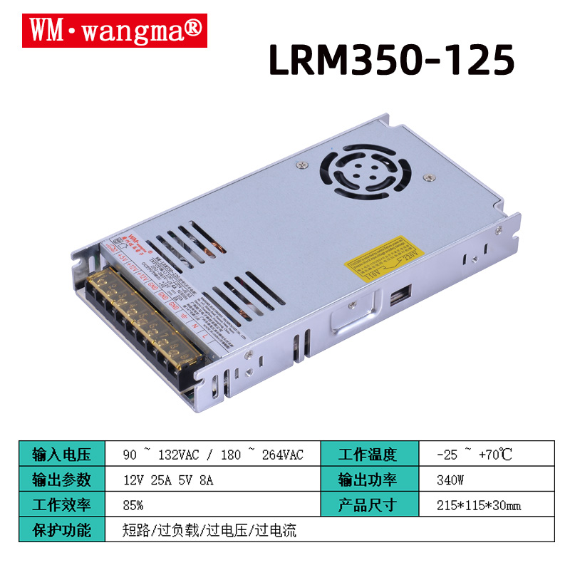 LRM350W-24V5V 为双路输出设计,而常见的 LRS-350 系列开关电源多为单路输出(如 24V 单路),单路型号适合仅需一种电压的场景,双路则更适配多电压设备的一体化供电。