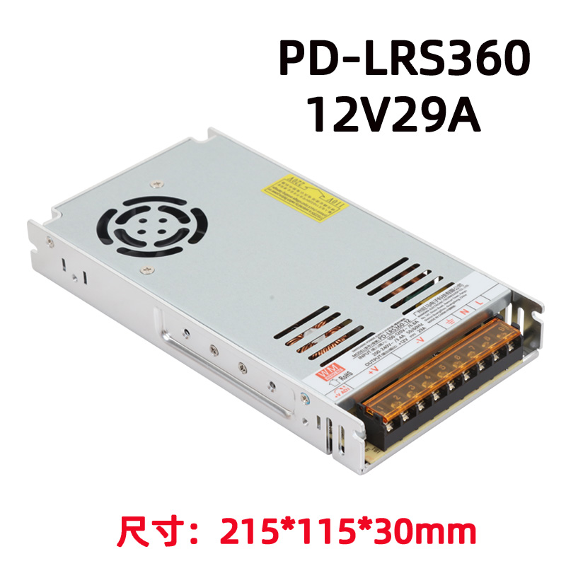 功率与输出电压:额定 360W 单路直流输出,常规型号覆盖 12V(30A)、24V(15A)、36V(10A)、48V(7.5A);输出电压可微调(如 24V 通常可调 22~26.4V),满足设备微调需求。