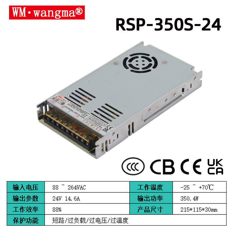 旺马 RSP-350S(RSP350)系列 350W 超薄单组输出开关电源,该系列是广州旺马电子推出的高可靠、高效率工业级电源,兼具主动 PFC 与完善保护,适配多场景严苛工况。