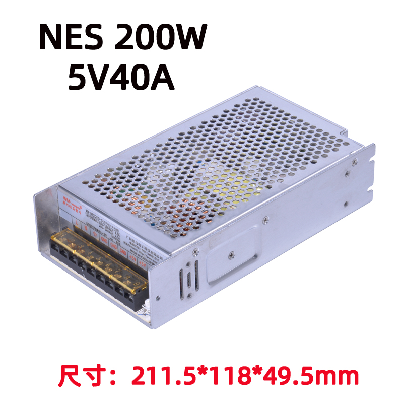 旺马 NES200-5V开关电源是广州旺马电子生产的200W、5V/40A 工业级单路输出 AC-DC 开关电源,为标准 NES-200 系列的本土化优化型号,主打高可靠、低纹波、宽温、无风扇,适配工业自动化、游乐、安防、LED 等场景。| 项目 | 参数 |