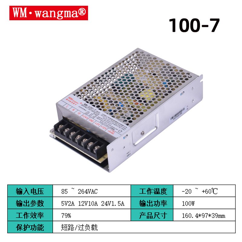旺马 WM‑100‑7游艺设备电源是专为游艺 / 电玩设备设计的三路输出开关电源,适配娃娃机、兑币机、街机、赛车 / 枪机等设备,提供稳定的5V/12V/24V多路供电。